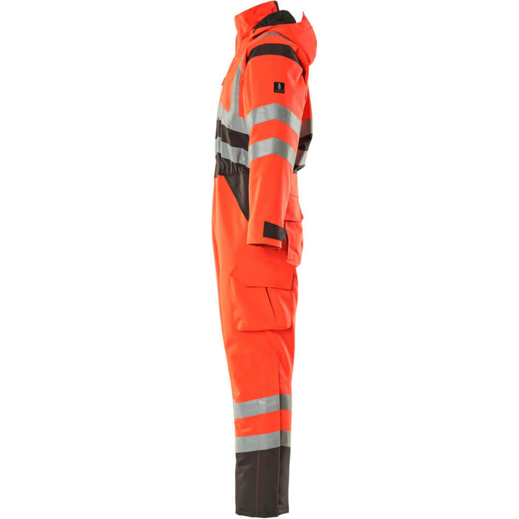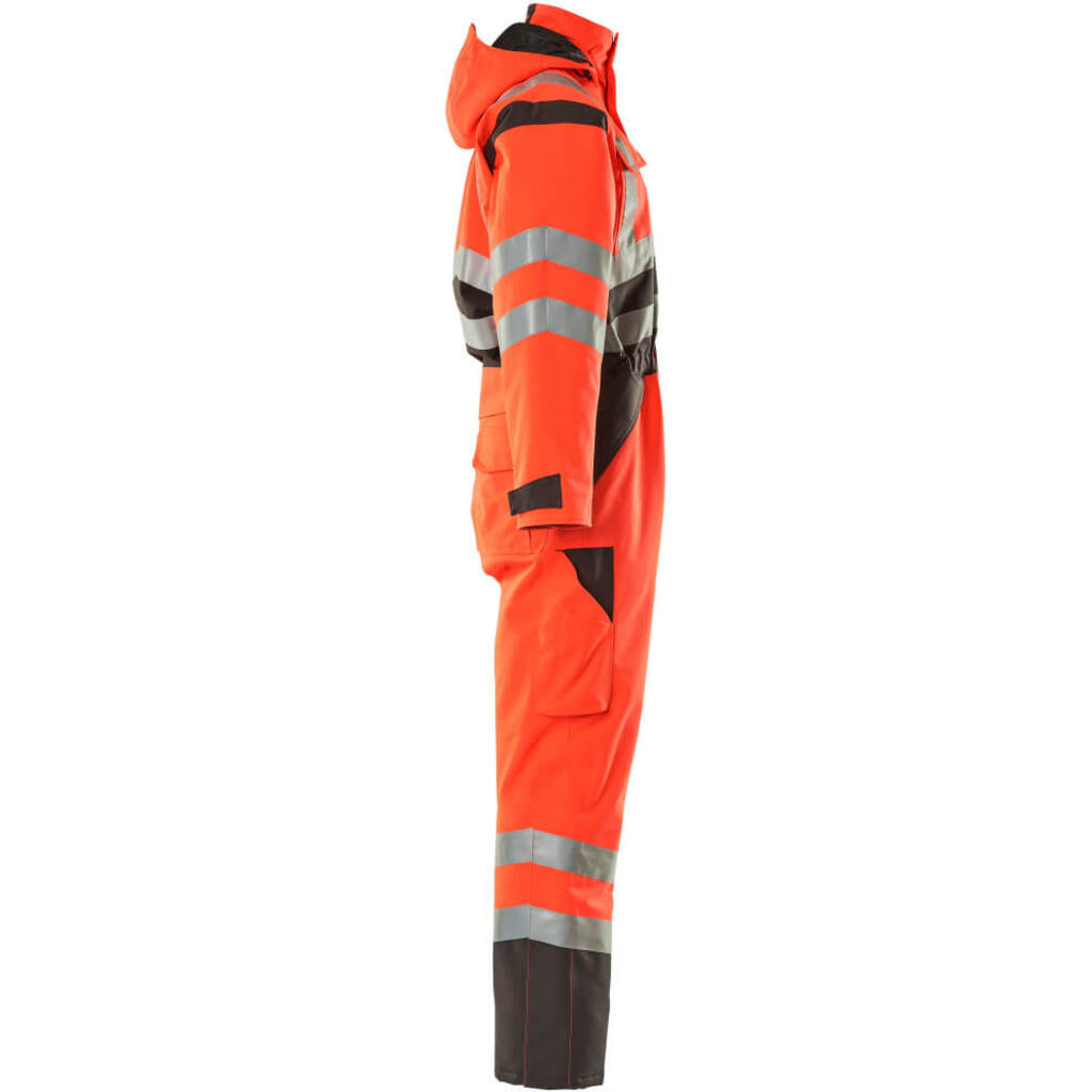 Fluoreszierend und mit schrägverlaufenden Reflexen. Zweifarbig. Atmungsaktiv, wind- und wasserdicht. Nähte sind verklebt. Zweifache Kappnähte an den Beinen und im Schritt. Futter aus Kunstpelz am Körper. Futter aus Stepp in Beinen und Ärmeln. Kapuze ist abnehmbar, gefüttert und mit verstellbaren Elastikschnüren versehen. Innenkragen aus Strick. Verschluss mit Reißverschluss, Wetterschutzleiste sowie verdeckten Druckknöpfen. Reißverschlusstaschen unter der Wetterschutzleiste. Brusttasche mit Reißverschluss. Brusttasche mit Patte und Magnetverschluss. D-Ring. Stifthalter. Vordertaschen mit Wetterschutzleiste. Innentasche mit Reißverschluss. Ergonomisch geschnittene Ärmel ermöglichen hohe Bewegungsfreiheit. Ärmeltasche mit Reißverschluss. Gesäßtaschen mit Verstärkungen und Patte mit Klettverschluss. Schenkeltasche mit Patte und Klettverschluss. Zollstocktasche. Reißverschluss mit Wetterschutzleiste am äußeren Beinabschluss. Rippenbündchen (verdeckt unter der Wetterschutzleiste) und Druckknopfverschluss an den Handgelenken. Produkte, die Magnete enthalten, dürfen NICHT von Personen mit einem Herzschrittmacher/ICD o.ä. getragen werden.