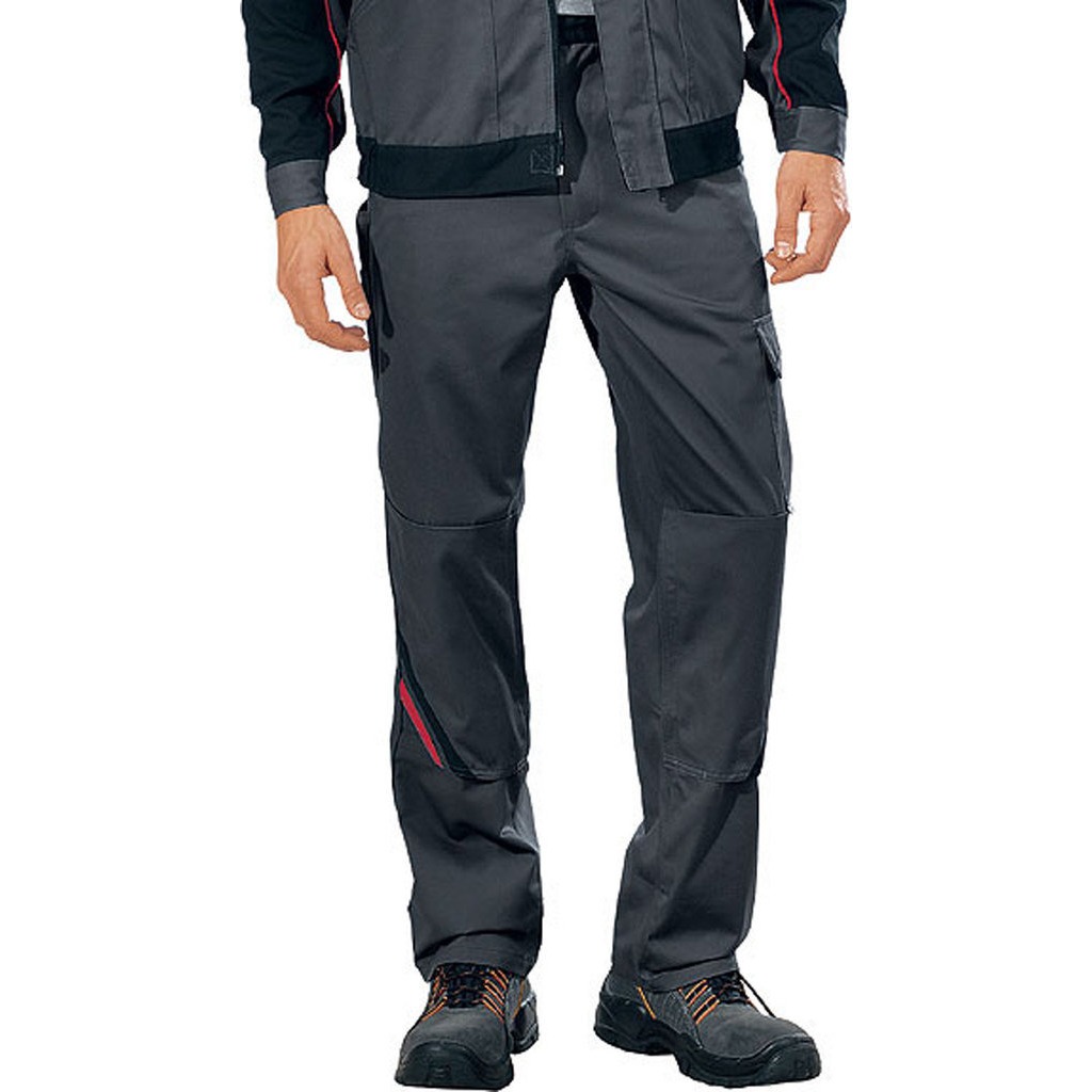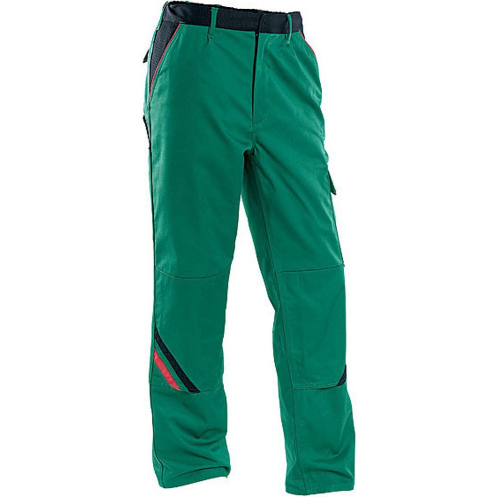 Mit 2 geräumigen Eingriffstaschen, 2 Gesäß-Pattentaschen, 1 Oberschenkel-Pattentasche mit Klett, 1 doppelten Zollstocktasche, 2 aufgesetzten Knietaschen, Gummizug im Bund, 7 Gürtelschlaufen und Hosenschlitz mit Reißverschluss. Tascheneingriffe und -patten sind mit farbigen Biesen abgesetzt. Aus 65% Polyester und 35% Baumwolle, 280 g/m2. Waschbar bis 60°.