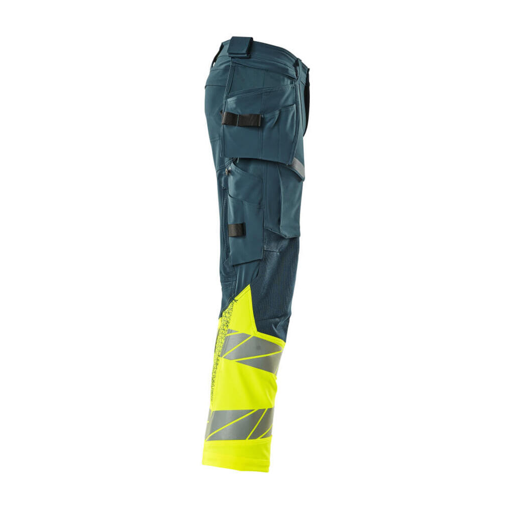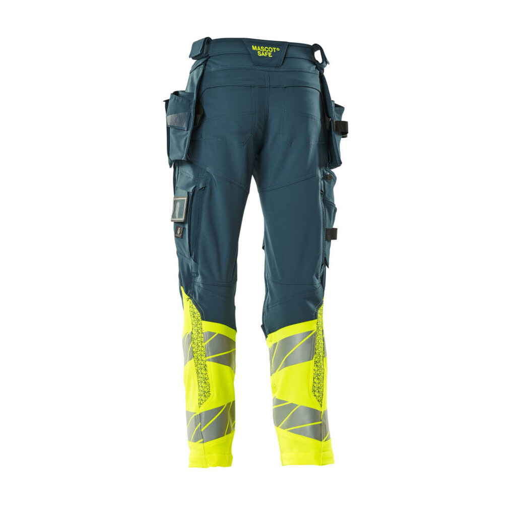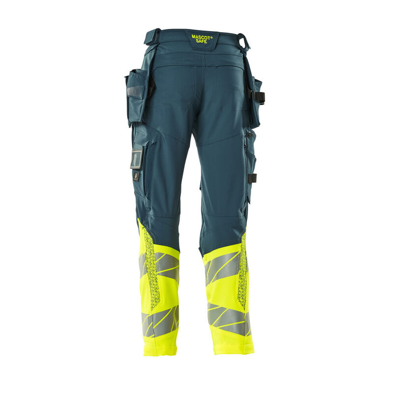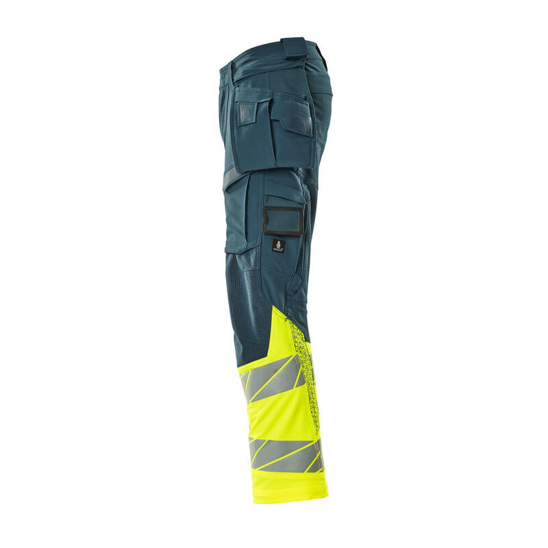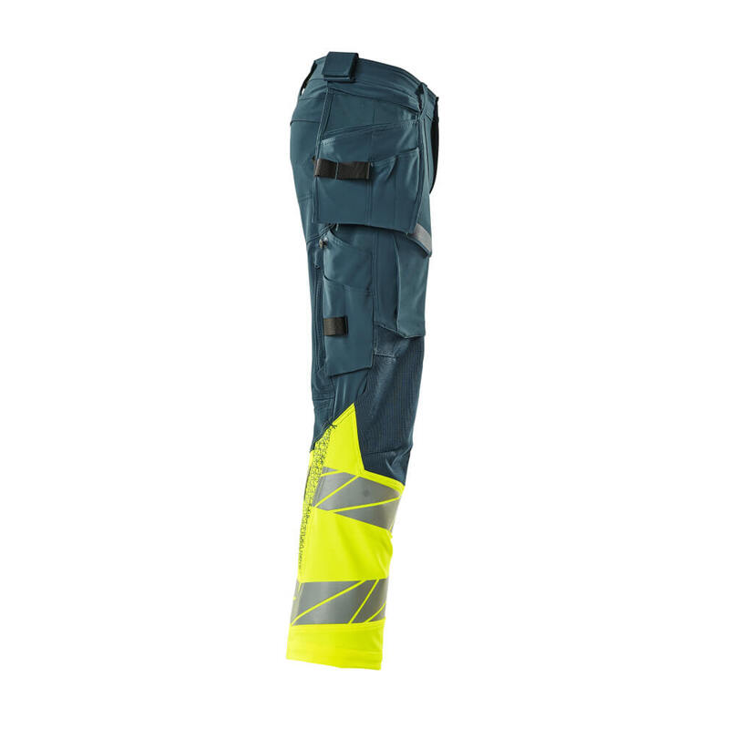 Fluoreszierende Kontrastfarbe und mit Reflexen. Hat ein wasserabweisendes Finish. Zweifarbig. Vier-Wege-Stretchstoff mit geringem Gewicht und guter Strapazierfähigkeit. Zweifache Kappnähte an den Beinen und im Schritt. Niedrige Taille. Verdeckter Knopfverschluss. Hosenbeine sind ergonomisch geformt. Abnehmbare Hängetaschen. Innere Hängetasche mit Druckknopfverschluss. Hängetasche mit gefütterter Handytasche und Magnetverschluss. Hängetaschen mit Kevlar® und CORDURA®-Gewebe Verstärkungen. Gürtelschlaufen. Werkzeugschlaufen an beiden Seiten des Bundes. Hosenschlitz mit Reißverschluss. Vordertaschen. Gesäßtaschen, verstärkt und mit Patte. Beidseitig verdeckte Hammerschlaufen. Knopf (abnehmbar) zum Befestigen eines Messerhalters. Zollstocktasche mit Kevlar®-Verstärkungen. Taschen mit Patte vorne am Oberschenkel. Knietaschen aus CORDURA® Zwei-Wege-Stretchstoff mit Belüftung. Einfache, individuelle Regulierung der Knietaschenhöhe. Schenkeltasche mit gefütterter Handytasche, Magnetverschluss und integriertem ID-Kartenhalter. ID-Kartenhalter ist abnehmbar. Senkrechter Reißverschluss für Belüftung am Oberschenkel hinten. Druckeffekten. Die Schrittlänge kann um 3 cm verlängert werden, indem die rote Naht innen am Beinabschluss entfernt wird. Wir empfehlen den 00718-100, 00418-100, 50454-916 & 20118-915 Knieschutz zu diesem Modell.