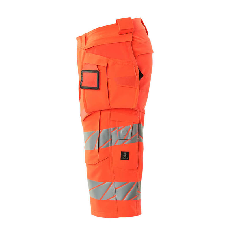 Fluoreszierend mit Reflexen. Hat ein wasserabweisendes Finish. Vier-Wege-Stretchstoff mit geringem Gewicht und guter Strapazierfähigkeit. Zweifache Kappnähte an den Beinen und im Schritt. Niedrige Taille. Verdeckter Knopfverschluss. Abnehmbare Hängetaschen. Innere Hängetasche mit Druckknopfverschluss. Hängetasche mit gefütterter Handytasche, Magnetverschluss und integriertem ID-Kartenhalter. ID-Kartenhalter ist abnehmbar. Hängetaschen mit Kevlar® und CORDURA®-Gewebe Verstärkungen. Gürtelschlaufen. Werkzeugschlaufen an beiden Seiten des Bundes. Hosenschlitz mit Reißverschluss. Vordertaschen. Gesäßtaschen, verstärkt und mit Patte. Beidseitig verdeckte Hammerschlaufen. Knopf (abnehmbar) zum Befestigen eines Messerhalters. Zollstocktasche mit Kevlar®-Verstärkungen. Taschen mit Patte vorne am Oberschenkel. Schenkeltasche mit gefütterter Handytasche und Magnetverschluss. Ohne Druckeffekte.