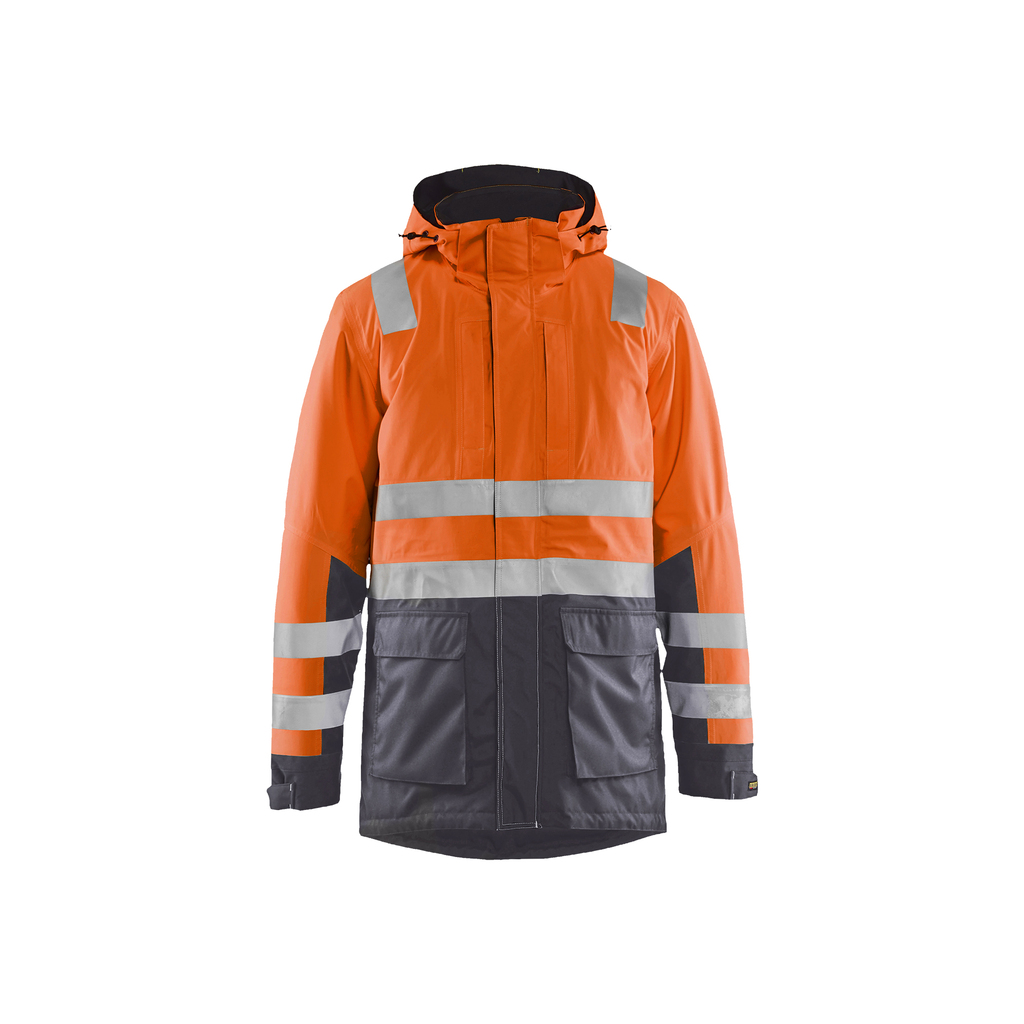 Ein warmes Winter Kleidungsstück für harte Arbeitsumgebungen wo es wichtig ist, gesehen zu werden. Der Parka besteht aus einem starken wind- und wasserfesten Material mit verschweißten Nähten und einem warmen Steppfutter, das komfortabel ist und vor Kälte und Wind schützt. Er hat ein strapazierfähiges Außenmaterial in einem dunkleren Farbton an Stellen, die dem meisten Schmutz ausgesetzt sind. Die Jacke hat einen Zwei-Wege Reißverschluss vorne und vorgeformte Ärmel für einen besseren Komfort. Die Taille kann mit einem Kordelzug am Rücken für einen besseren Sitz eingestellt werden. Die Reflexstreifen sind heiß gepresst für mehr Flexibilität und die schützende Kapuze hat Druckknöpfe, damit sie leicht dran gemacht und abgenommen werden kann. Zertifiziert nach EN 342 kombiniert mit 1885; EN 343; EN ISO 20471 Klasse 3, Schutzkleidung für hohe Sichtbarkeit.