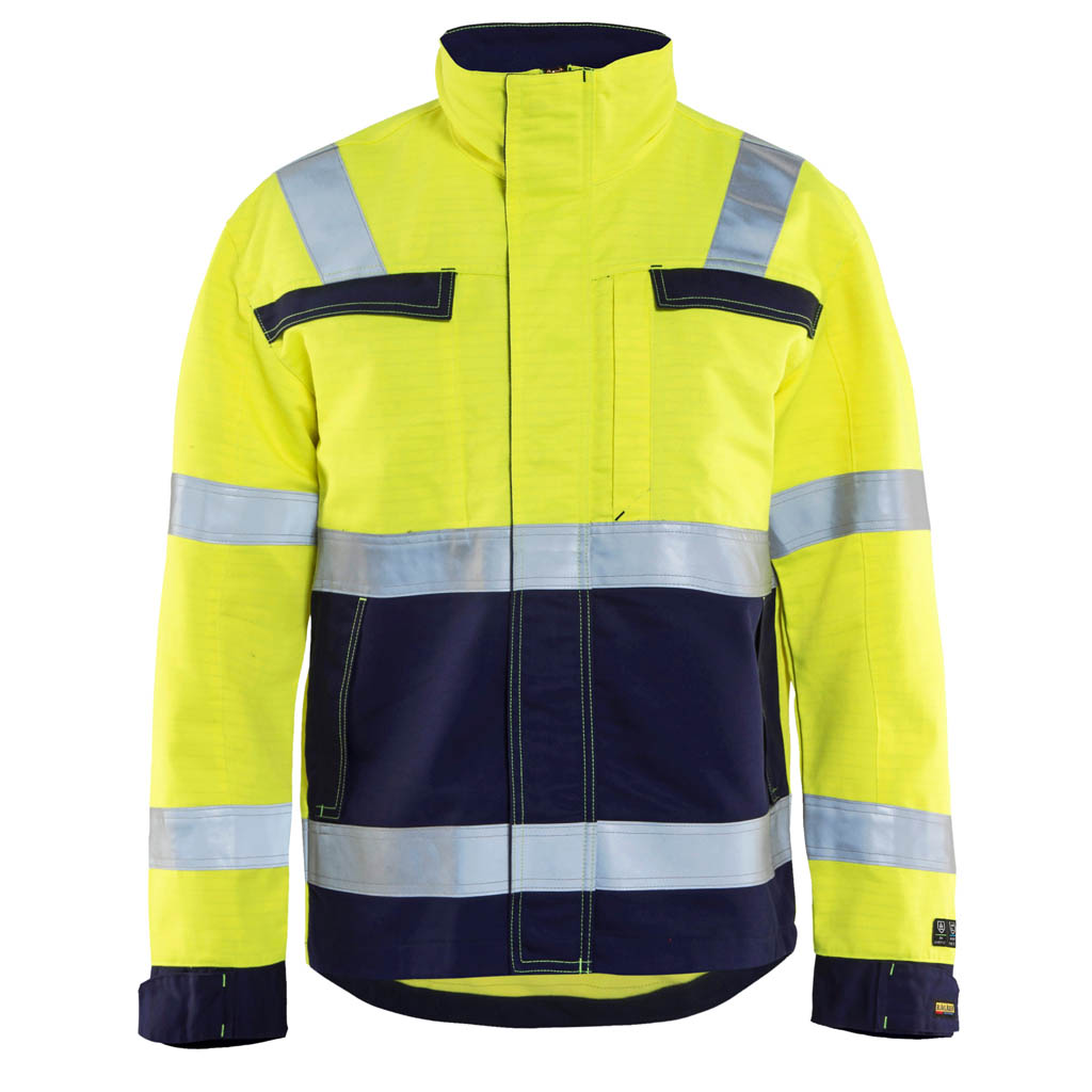 Multinorm Jacke aus einem robusten Material, entwickelt, um aus jeder Richtung sichtbar zu sein. Die Jacke ist vorne kürzer für maximale Bewegungsfreiheit und hat einen verlängerten Rücken für höheren Schutz. Sie hat Brusttaschen auf beiden Seiten und besitzt intelligente Details, wie eine Innentasche mit Handyinnentasche und dunklerem Stoff an Stellen, die dem meisten Schmutz ausgesetzt sind. Industriewäsche geeignet. Schützt vor flüssigen Chemikalien. Zertifiziert nach EN 1149-5. EN 13034 PB [6]. EN ISO 20471, XS Klasse 2, S -> Klasse 3. EN ISO 11611, Klasse 1 A1+A2. EN ISO 11612 A1, A2, B1, C1, E3, F1. IEC 61482-2, Klasse 1. ATPV: 11,0 cal/cm2, HAF: 82,0%.