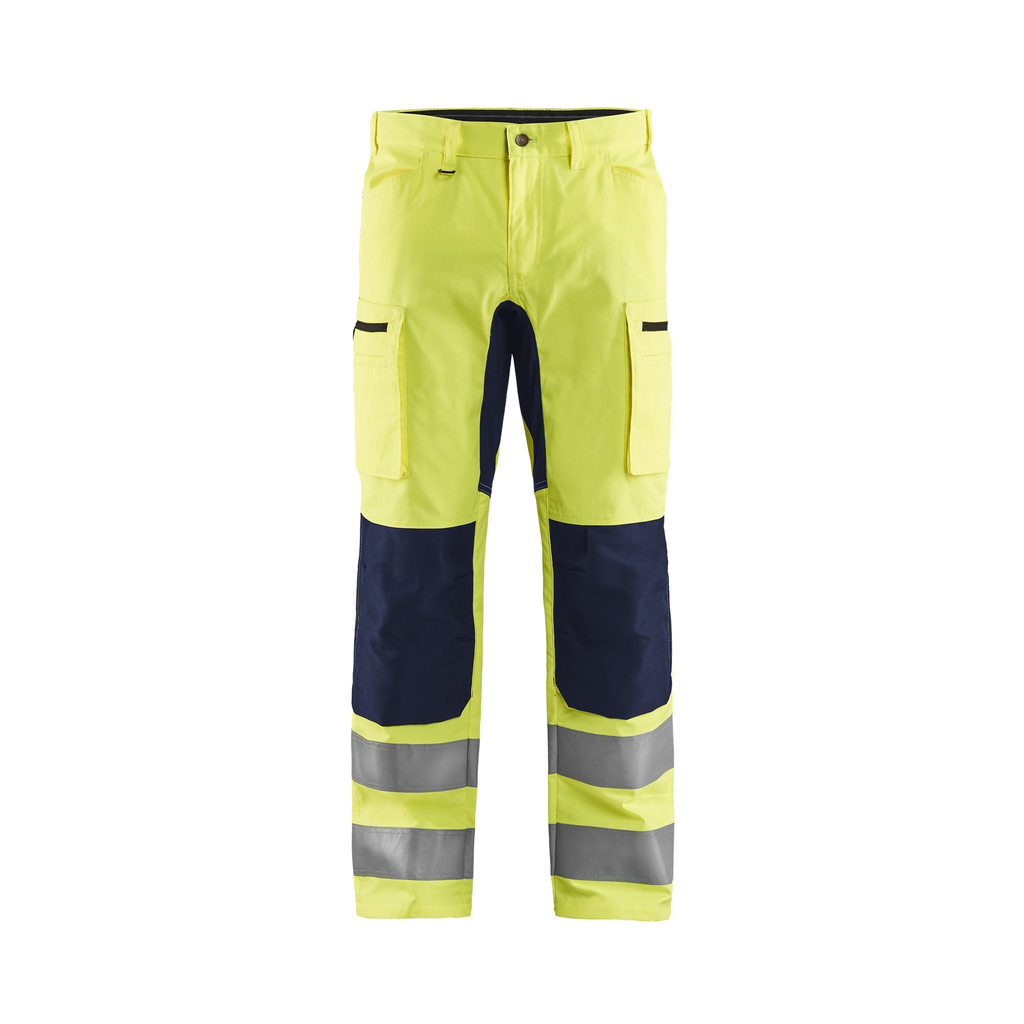 High Vis Arbeitshose mit Stretch Einsätzen im Schritt, an der Hüfte und Kniepolstertaschen aus CORDURA® Stretch für optimalen Komfort. Zertifiziert nach EN ISO 20471, Klasse 1. Kniepolstertasche passend zu Kniepolster 4027.