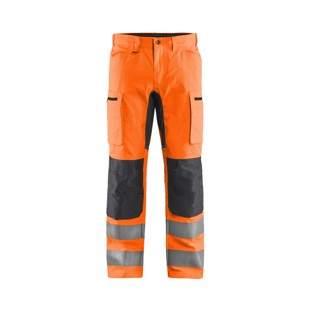 High Vis Arbeitshose mit Stretch Einsätzen im Schritt, an der Hüfte und Kniepolstertaschen aus CORDURA® Stretch für optimalen Komfort. Zertifiziert nach EN ISO 20471, Klasse 1. Kniepolstertasche passend zu Kniepolster 4027.