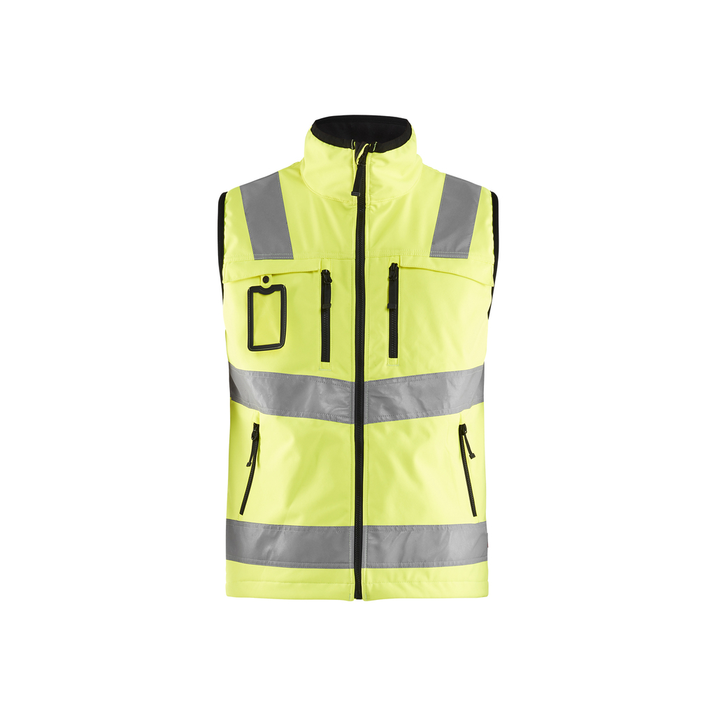 Moderne Softshell Weste in High Vis Farben aus einem wasserabweisenden und atmungsaktiven Stoff. Die Weste hat einen hohen Kragen und ein weiches Fleecefutter. Zertifiziert nach EN 20471 für bessere Sichtbarkeit bei der Arbeit.