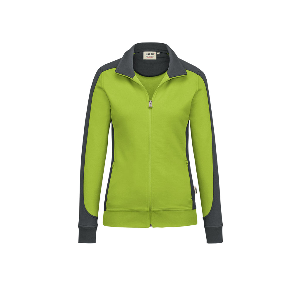 Besonders strapazierfähige Sweatjacke für Damen, mit kontrastfarbigen Einsätzen an den Seiten, Schultern und Ärmeln, formstabilen Bündchen mit LYCRA®-Anteil, nicht angerauter Innenseite (French-Terry), Nackenband, hochwertigem Frontreißverschluss und seitlichen Einschubtaschen mit Reißverschluss. Alle Reißverschlüsse von YKK®. Leasingkoller zur einfachen Kennzeichnung in der gewerblichen Wäscherei und Aufhängebänder im Saum. Hergestellt aus weicher, besonders pflegeleichter und funktioneller Maschenware aus dem HAKRO Performance-Materialmix Mikralinar®. Gewebtes HAKRO Necklabel aus hochwertigem Kettsatin mit weichen, ultraschallgeschnittenen Bandkanten für höchsten Tragekomfort und gewebtes HAKRO Flaglabel an der linken Seitennaht. • Material: Mikralinar®, Maschenware aus 50 % Baumwolle und 50 % Polyester • Gewicht: 300 g/m2 • Ausrüstung: einlaufvorbehandelt • Eigenschaft: geeignet für die Industriewäsche nach DIN EN ISO 15797, pflegeleicht • Passform: Regular Fit • Zertifikate: OEKO-TEX® STANDARD 100 • Waschtemperatur: 60 °C • Größen: XS-6XL