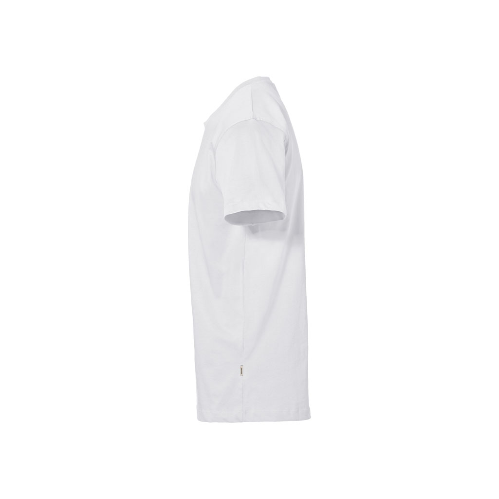 Klassisches T-Shirt mit rundem Halsausschnitt, LYCRA®-verstärktem Halsbündchen und Nackenband. Hergestellt aus feinem, mittelschwerem Single-Jersey aus langstapeliger, gekämmter und ringgesponnener CmiA-Baumwolle. Gewebtes HAKRO Necklabel aus hochwertigem Kettsatin mit weichen, ultraschallgeschnittenen Bandkanten für höchsten Tragekomfort und gewebtes HAKRO Flaglabel an der linken Seitennaht.