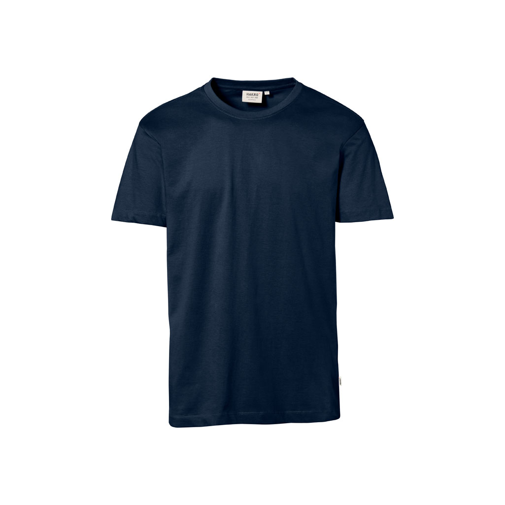 Klassisches T-Shirt mit rundem Halsausschnitt, LYCRA®-verstärktem Halsbündchen und Nackenband. Hergestellt aus feinem, mittelschwerem Single-Jersey aus langstapeliger, gekämmter und ringgesponnener CmiA-Baumwolle. Gewebtes HAKRO Necklabel aus hochwertigem Kettsatin mit weichen, ultraschallgeschnittenen Bandkanten für höchsten Tragekomfort und gewebtes HAKRO Flaglabel an der linken Seitennaht.