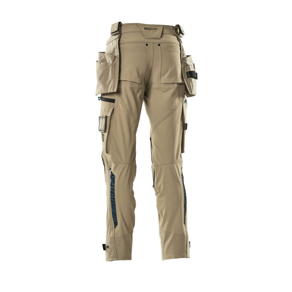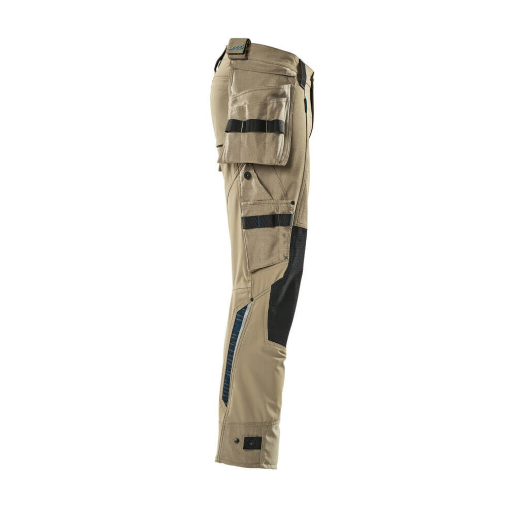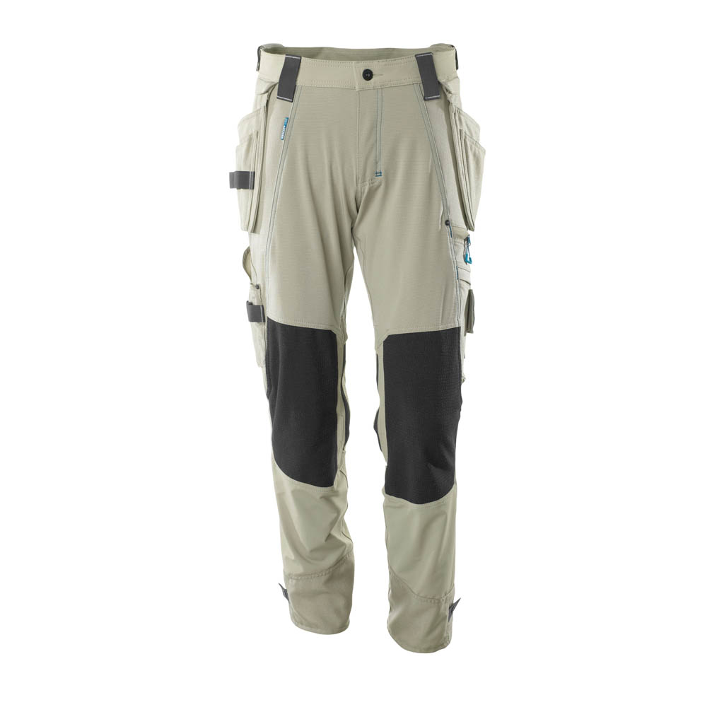 Hat ein wasserabweisendes Finish. Vier-Wege-Stretchstoff mit geringem Gewicht und hoher Strapazierfähigkeit. Der Stoff ist fast nicht auf der Haut zu spüren, da die Taschen im Design integriert sind. Zweifache Kappnähte an den Beinen und im Schritt. Niedrige Taille. Hosenbeine sind ergonomisch geformt. Gürtelschlaufen. Hosenschlitz mit Reißverschluss. Abnehmbare Hängetaschen aus strapazierfähigem CORDURA®-Gewebe - das Vorderteil der rechten Hängetasche hat Verstärkungen aus durchstichfestem Kevlar® im Boden. Vordertaschen. Gesäßtaschen. Werkzeugschlaufen an beiden Seiten des Bundes. Schenkeltasche mit Handytasche mit Magnetverschluss und integriertem ID-Kartenhalter. ID-Kartenhalter ist abnehmbar. Zollstocktasche aus CORDURA® Gewebe mit extra Taschen. Strapazierfähige und durchstichfeste Knietaschen aus CORDURA®/Kevlar®/Dyneema® sind elastisch und mit Ventilation. Druckknopfregulierung an den Fußgelenken. Reflexeffekte. Wir empfehlen den 00718-100, 50451-916 & 20118-915 Knieschutz zu diesem Modell.