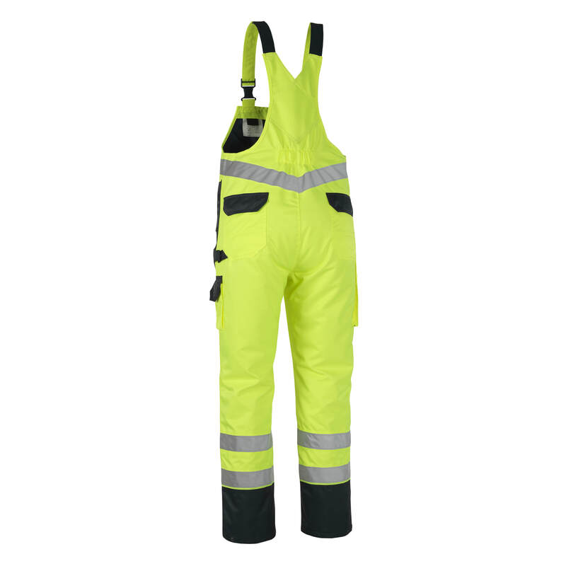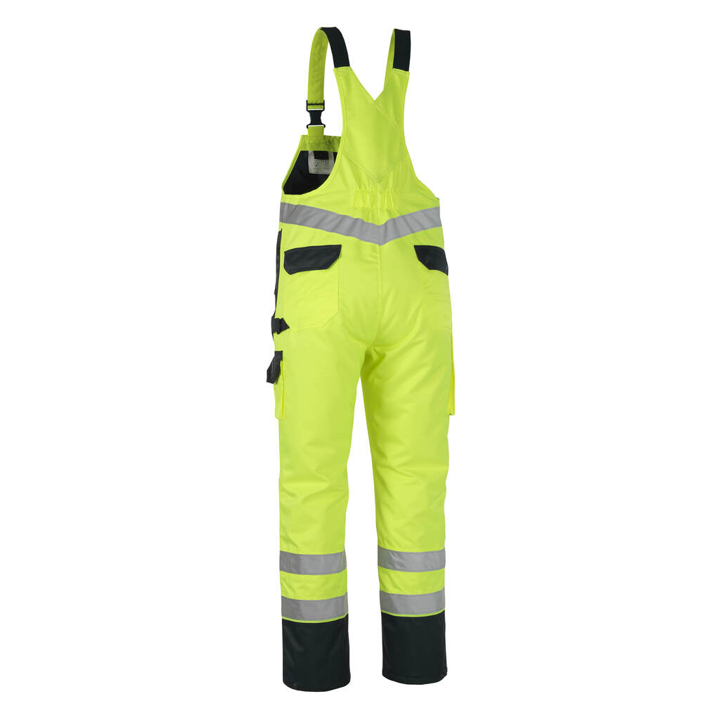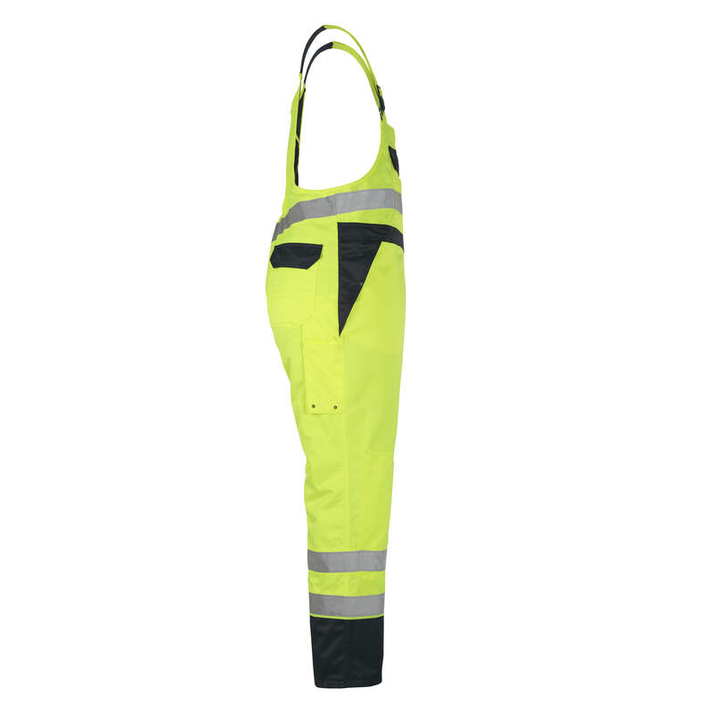 Fluoreszierend mit Reflexen. Zweifarbig. Atmungsaktiv, wind- und wasserdicht. Nähte sind verklebt. Futter aus leichter Qualität. Schulterträger aus Stoff, verstellbar und mit kurzem, kräftigem Gummizug sowie Kunststoffschnallen versehen. Latztasche mit Patte und Stifttaschen. Gummizug im Rücken. Vordertaschen mit Patte und Druckknopfverschluss. Gesäßtaschen mit Verstärkungen und Patte mit Klettverschluss. Hammerschlaufe, verstellbar. Schenkeltasche mit Patte und Klettverschluss. Zollstocktasche. Knietaschen, höhenregulierbar. Druckknopfregulierung an den Fußgelenken. Wir empfehlen den 00718-100, 00418-100, 50454-916 & 20118-915 Knieschutz zu diesem Modell.