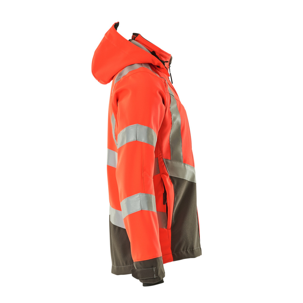 Fluoreszierend und mit Reflexschulterstreifen sowie schrägverlaufenden Reflexen. Zweifarbig. Atmungsaktiv, winddicht und wasserabweisend. Fleece an der Innenseite. Verschluss mit Reißverschluss und inwendiger Wetterschutzleiste. Kapuze ist abnehmbar, gefüttert und mit verstellbaren Elastikschnüren versehen. Stehkragen. Innentaschen. Reißverschlussinnentasche speziell für Handys entwickelt, mit Öffnung sowie Schlaufen für das Kopfhörerkabel. Rücken ist verlängert. Brusttasche mit Reißverschluss. D-Ring. Stifttasche. Ergonomisch geschnittene Ärmel ermöglichen hohe Bewegungsfreiheit. Rippenbündchen (verdeckt unter der Wetterschutzleiste) an den Handgelenken. Manschetten mit Verstärkungen aus CORDURA®-Gewebe und Klettverschluss. Vordertaschen mit Reißverschluss.