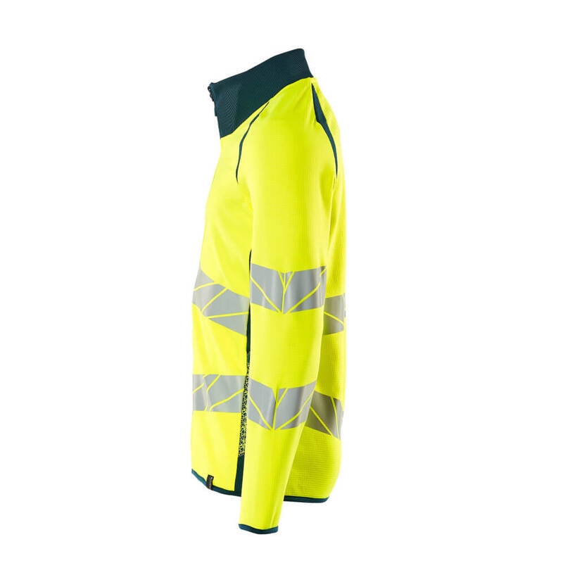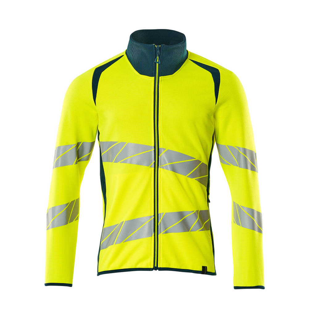 Fluoreszierend und mit schrägverlaufenden Reflexen. Zweifarbig. Moderne Passform. Angenehme Baumwollinnenseite und strapazierfähiges Polyester mit Stretch an der Außenseite. Quadratisches Jacquardmuster. Reflexe sind elastisch. Reißverschluss, durchgehend. Vordertaschen mit Reißverschluss. Innentaschen. Rippenbündchen am Hals. Nackenbesatz. Elastikband an den Handgelenken und der Unterkante.