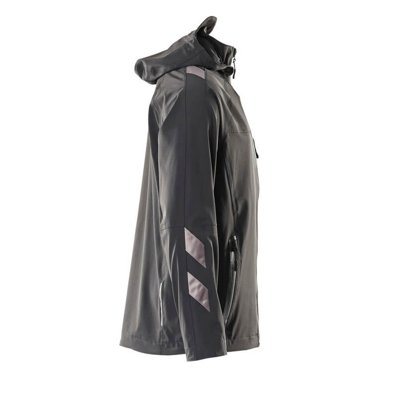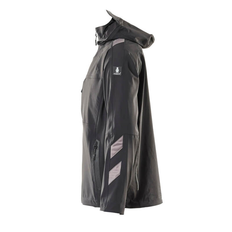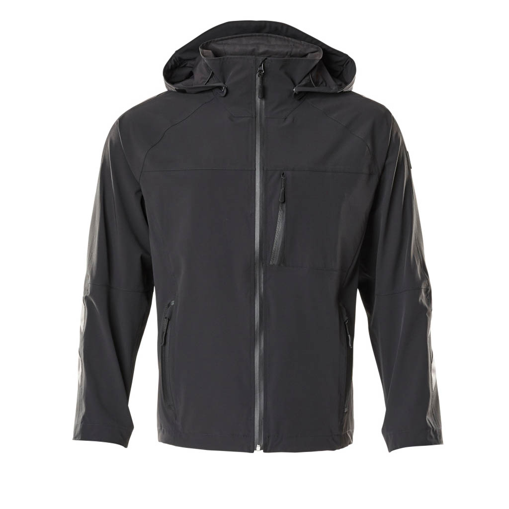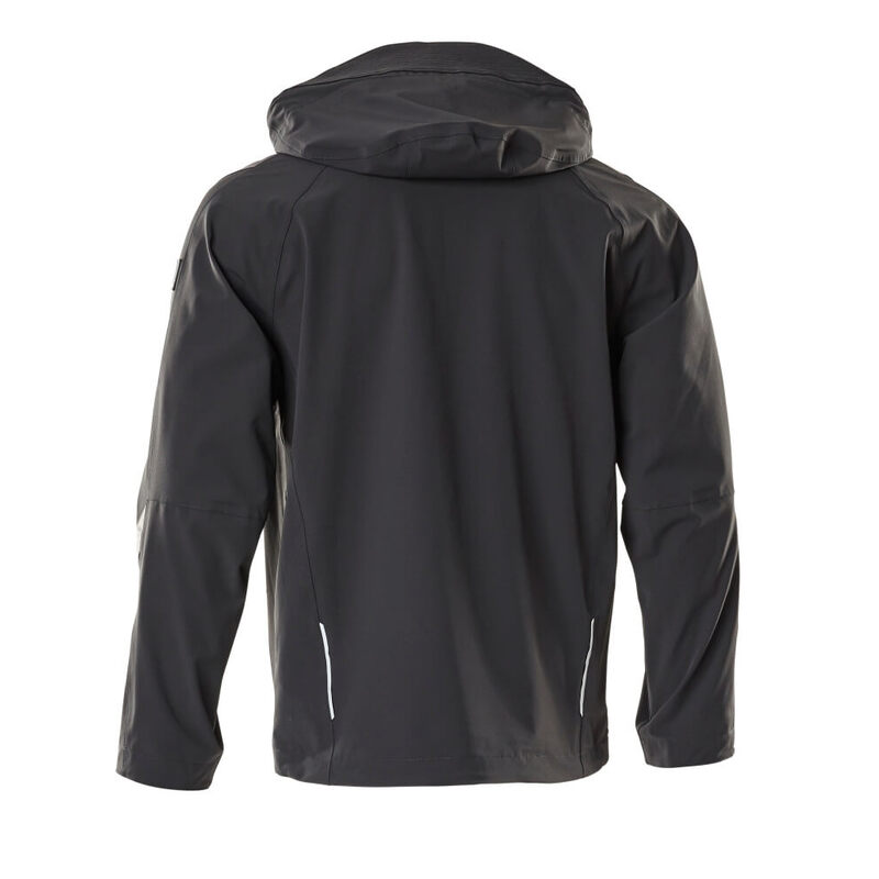 Vier-Wege-Stretchstoff mit geringem Gewicht und hoher Strapazierfähigkeit. Atmungsaktiv, wind- und wasserdicht. Nähte sind verklebt. Verschluss mit wasserdichtem Reißverschluss und inwendiger Wetterschutzleiste. Kapuze ist abnehmbar, gefüttert und mit verstellbaren Elastikschnüren versehen. Brusttaschen mit Reißverschluss. Ergonomisch geschnittene Ärmel ermöglichen hohe Bewegungsfreiheit. Vordertaschen mit Reißverschluss. Rücken ist verlängert. Gummizug in der Unterkante, regulierbar. Rippenbündchen (verdeckt unter der Wetterschutzleiste) an den Handgelenken. Reflexeffekte.