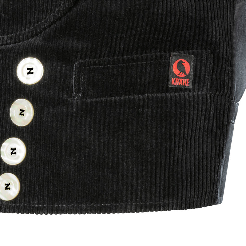 85% Baumwolle, 15% Polyester. Cord mit breiter Rippe.